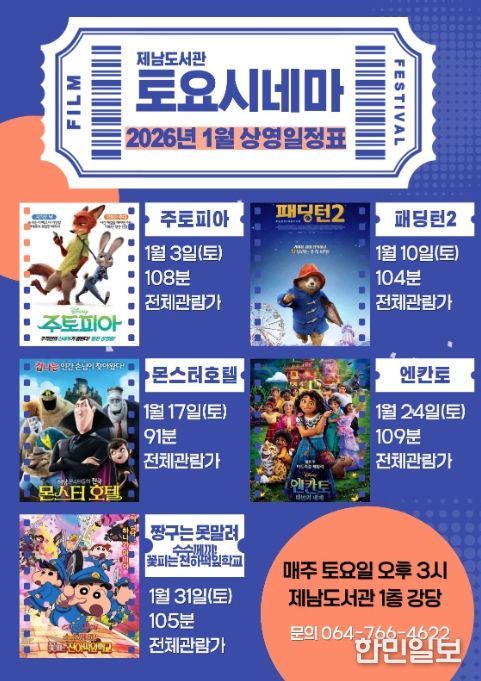 한민일보 서울포커스 임경복 기자 | 제주도교육청 제남도서관은 내년 1월 3일부터 12월 26일까지 매주 토요일 오후 3시 도서관 강당(지하)에서 영화 상영 프로그램 ‘토요시네마’를 운영한다.