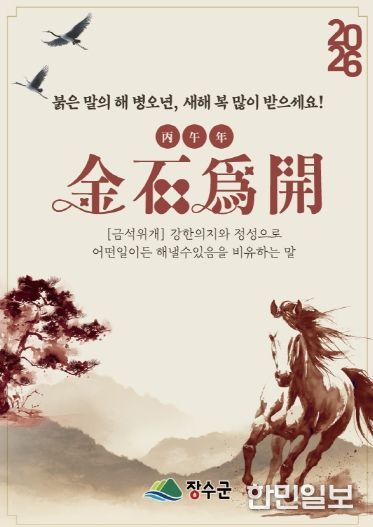 한민일보 서울포커스 김용택 기자 | 장수군은 2026년 병오년(丙午年) 새해를 맞아 군정 운영의 방향을 담은 신년 사자성어로 ‘금석위개(金石爲開)’를 선정했다.