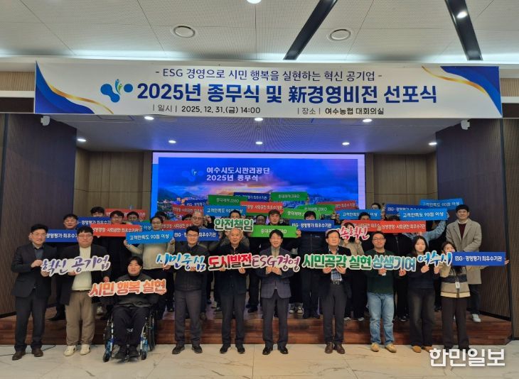 한민일보 서울포커스 임광현 기자 | 여수시도시관리공단은 31일 공단 대회의실에서 ‘新 경영비전 선포식’을 개최하고, 향후 5년간 공단이 나아갈 새로운 경영 철학과 조직 혁신 의지를 대내외에 공식적으로 밝혔다.