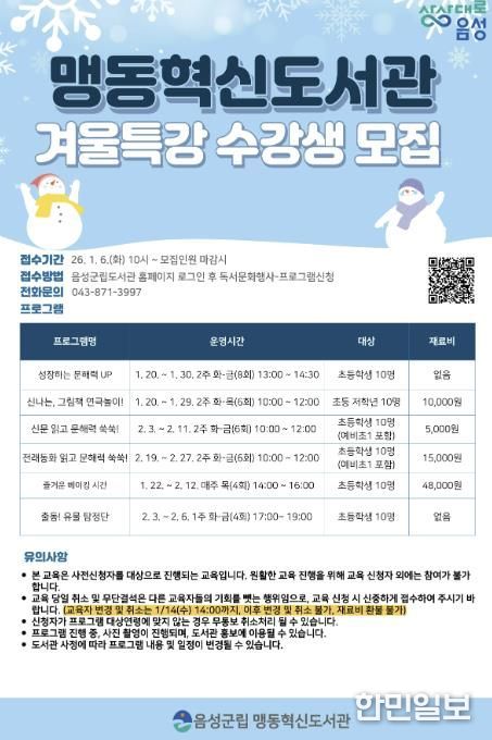 한민일보 서울포커스 김다남 기자 | 음성군 맹동혁신도서관은 겨울방학을 맞아 관내 초등학생들을 대상으로 겨울특강을 마련해 참여자를 모집한다.