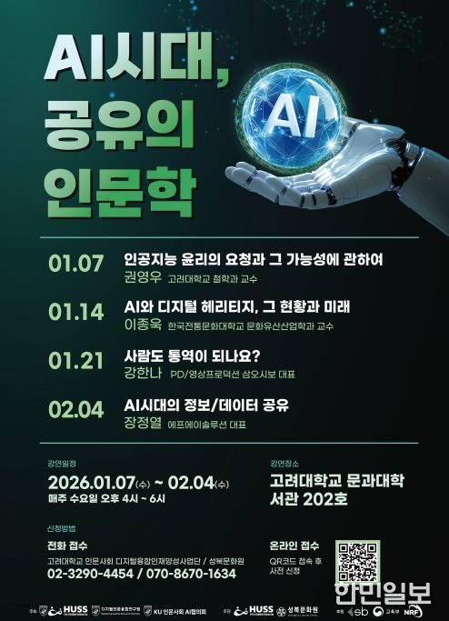이번 시민강좌는 고려대학교 인문사회 디지털융합인재양성사업단(HUSS사업단)과 고려대 디지털인문융합연구원, KU인문사회AI협의회가 공동 주최하고, 성북문화원과 HUSS사업단이 주관한다. 성북구청과 교육부, 한국연구재단이 후원하며, AI 시대의 미래를 시민과 함께 사유하기 위해 마련됐다.