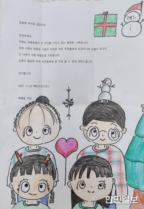 편지는 두 아이를 키우는 가정이라는 소개와 함께 도움이 필요한 이웃을 위하는 따뜻한 마음과 아이들이 직접 그린 눈사람, 선물 상자 등으로 꾸며져 따스함을 더했다.