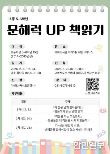 한민일보 서울포커스 김은금 기자 | 고양특례시 덕이도서관은 2026년 겨울방학을 맞아 아동과 청소년을 대상으로 한 독서·글쓰기 프로그램을 운영한다.