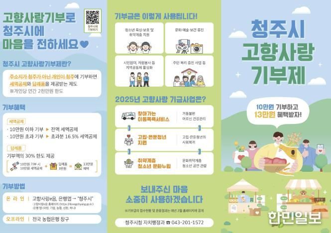 한민일보 서울포커스 김다남 기자 | 청주시는 2025년 고향사랑기부금 총 모금액이 5억 2천308만원을 기록해, 당초 목표액인 5억원을 초과 달성했다고 5일 밝혔다. 청주시가 연간 모금액 5억원을 돌파한 것은 이번이 처음이다.