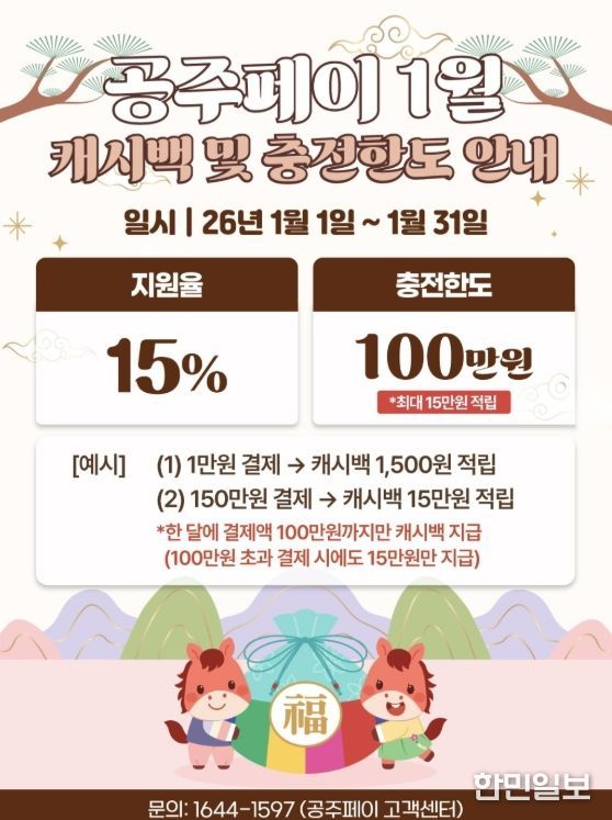 이에 따라 충전 시기와 관계없이 월 100만 원 한도 내에서 공주페이로 결제한 금액의 15%가 환급금으로 제공된다. 이용자는 한 달에 최대 15만 원까지 혜택을 받을 수 있다.