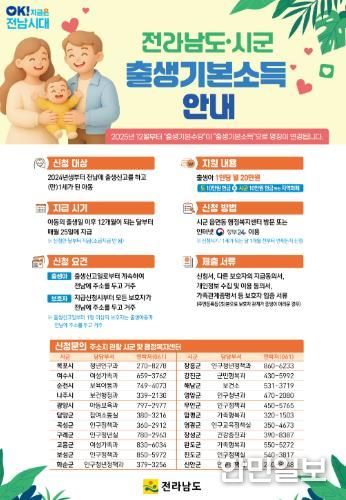 한민일보 서울포커스 박정민 기자 | 전라남도는 2024년생에 이어 전남에서 태어난 2025년생 출생아에게 전라남도–시군 출생기본소득을 지급한다.