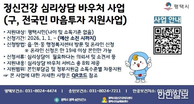 한민일보 서울포커스 황준형 기자 | 평택시에서는 시민의 마음 건강을 지키고 자살 예방 및 정신질환 조기 발견을 돕기 위한 ‘정신건강 심리상담 바우처사업’을 2026년에도 계속 추진한다.