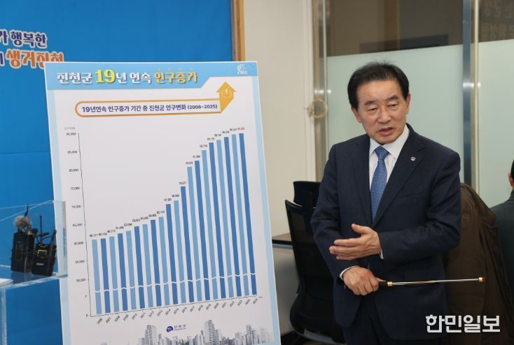 한민일보 서울포커스 김다남 기자 | 충북 진천군이 2025년에도 인구증가 기록을 이어가며 연속 인구증가 기록을 18년에서 19년으로 갈아치웠다.