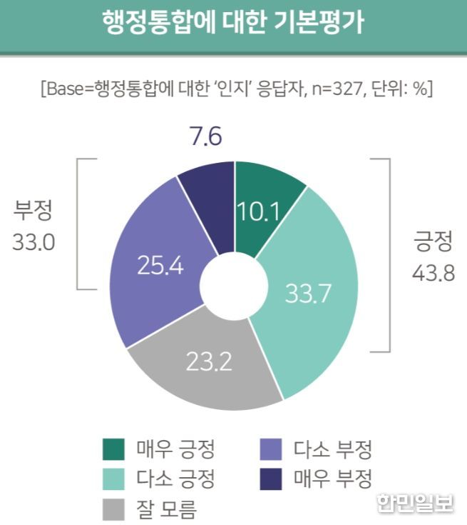 행정통합이‘지역 정체성 훼손 우려’가 있는지에 대해서는 긍정 30.9%, 부정 25.8%, 보통 43.3% 비율로 각각 대답했다.