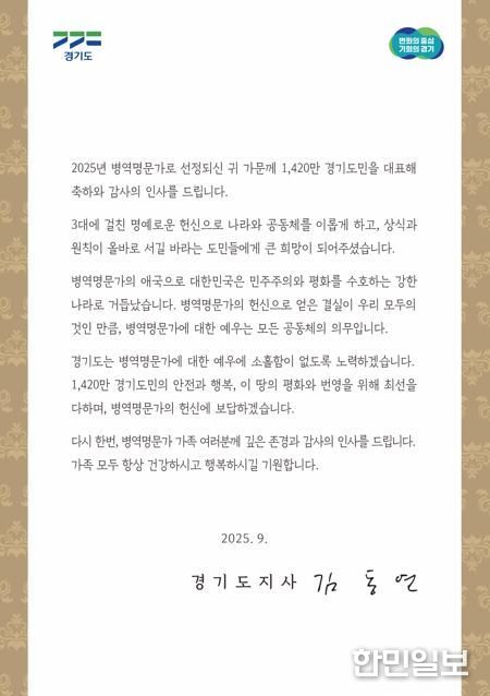 김동연 경기도지사는 서한문을 통해 “병역명문가의 애국으로 대한민국은 민주주의와 평화를 수호하는 강한 나라로 거듭났다”면서 “경기도는 병역명문가에 대한 예우에 소홀함이 없도록 노력하겠으며, 헌신에 보답하겠다”고 감사와 존경의 뜻을 표현했다.