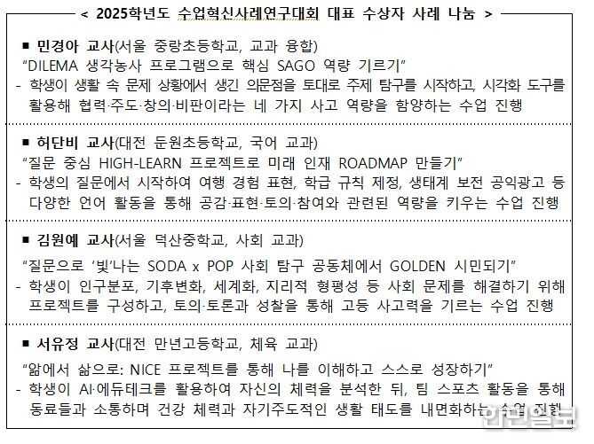 한민일보 서울포커스 임경복 기자 | 교육부와 한국교육과정평가원(원장 직무대리 박은아)은 1월 7일, 엘타워(서울)에서 수상자와 교육청 관계자 등이 참석한 가운데 ‘2025학년도 수업혁신사례연구대회 시상식’을 개최한다.