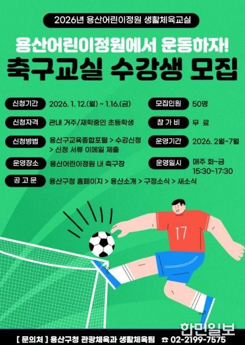 한민일보 서울포커스 김서윤 기자 | 서울 용산구가 유아 및 유소년의 건강한 성장 지원과 생활체육 참여 기회 확대를 위해 오는 2월부터 7월까지 ‘용산어린이정원 생활체육교실(축구)’을 운영한다.