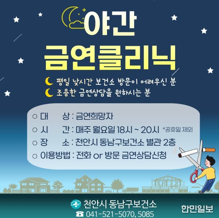 한민일보 서울포커스 황준형 기자 | 천안시 동남구보건소는 새해를 맞아 오는 11월까지 야간 금연클리닉을 운영한다고 8일 밝혔다.