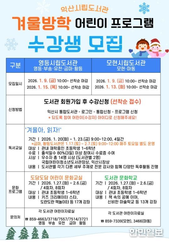 한민일보 서울포커스 김용택 기자 | 익산시가 겨울방학을 맞은 초등학생들을 위해 독서와 체험이 어우러진 다채로운 프로그램을 마련했다.