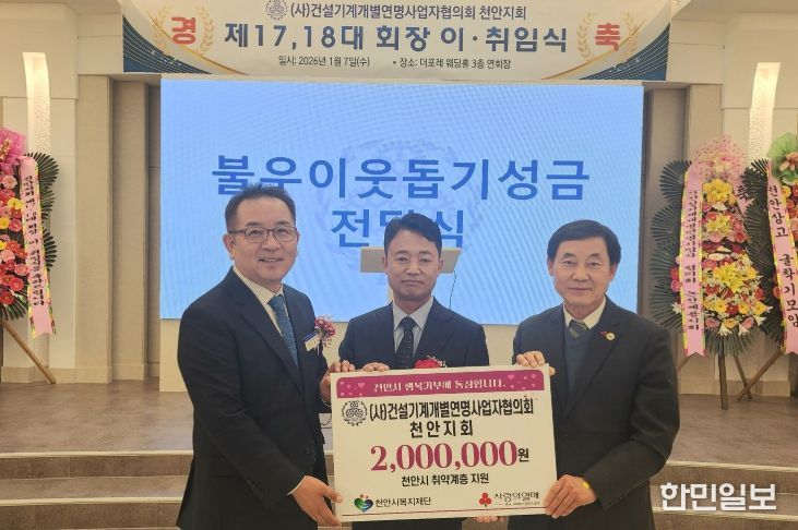 한민일보 서울포커스 황준형 기자 | (재)천안시복지재단은 ㈔건설기계개별연명사업자협의회 천안지회가 취약계층을 위한 후원금 200만 원을 기탁했다고 8일 밝혔다.