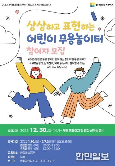 한민일보 서울포커스 전희주 기자 | 여주세종문화관광재단은 오는 1월 10일부터 시민예술학교 '상상하고 표현하는 어린이 무용 놀이터'를 진행한다.