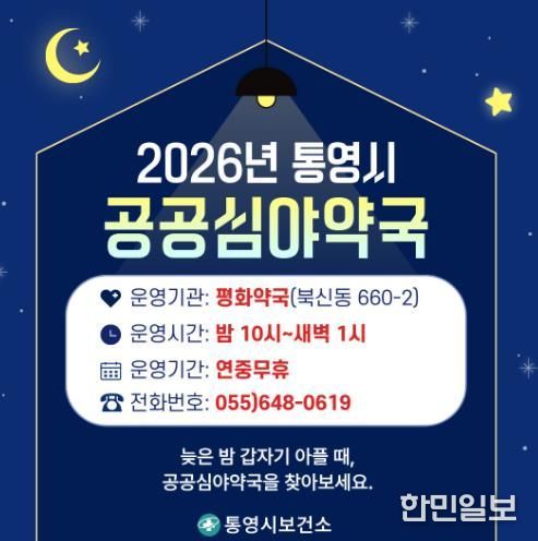 한민일보 서울포커스 김서윤 기자 | 통영시는 심야시간대 의약품 구매와 복약 상담에 어려움을 겪는 시민들의 불편을 해소하기 위해 북신동 소재 ‘평화약국’을 2026년 경상남도 공공심야약국 운영사업 참여기관으로 재지정 운영한다고 8일 밝혔다.