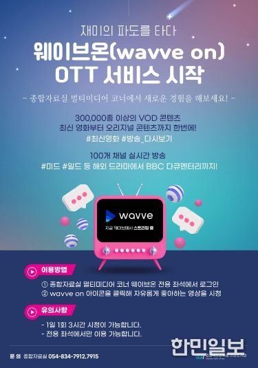 한민일보 서울포커스 김봉순 기자 | 경상북도교육청 의성도서관(관장 이미경)은 오는 13일부터이용자가 필요로 하는 영상을 실시간으로 제공하는 ‘웨이브온 VOD(Video On Demand)’ 서비스를 운영한다고 밝혔다.
