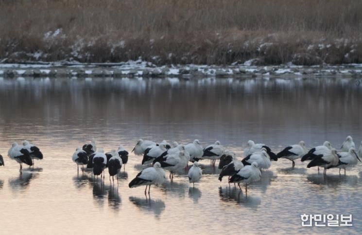 이는 새만금, 서산시, 태안군 등 국내 주요 황새 월동지들이 최근 한파로 결빙되면서 황새들이 얼지 않은 해리천으로 집중적으로 모여든 것으로 분석된다.