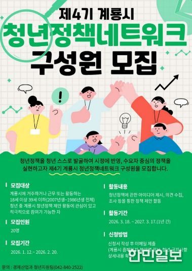 한민일보 서울포커스 임경복 기자 | 충남 계룡시는 이달 12일부터 오는 2월 20일까지 제4기 청년정책네트워크에 참여할 지역 청년을 모집한다.