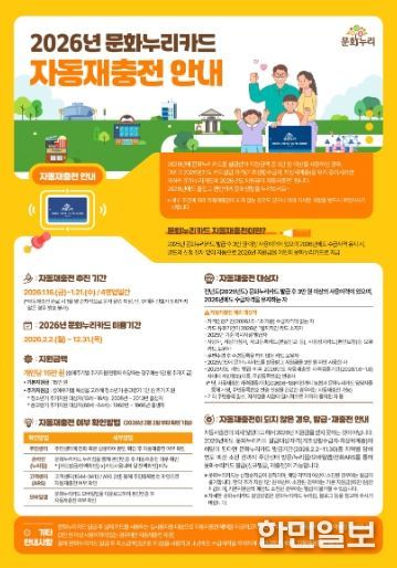 자동재충전 대상은 2025년 문화누리카드를 발급받은 자 중 3만 원 이상의 사용 이력이 있으며, 2026년에도 수급 자격을 유지하는 자로 한정된다. 해당 조건을 충족하면 별도 신청 절차 없이 자동으로 충전되고 1월 중 완료 문자가 발송될 예정이다.
