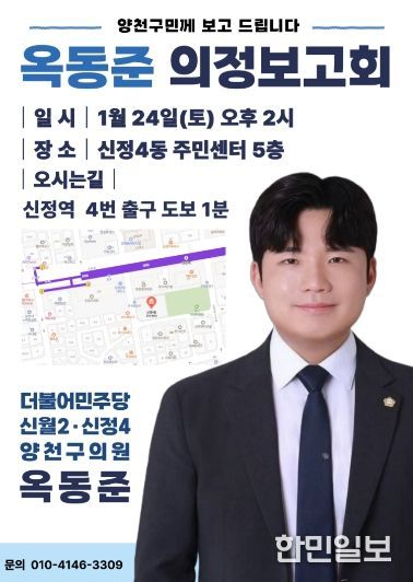 한민일보 서울포커스 국용호 기자 | 양천구의회 옥동준 의원(더불어민주당, 신정4·신월2동)이 오는 24일 오후 2시 양천구 신정4동 주민센터에서 의정보고회를 열어 그간의 의정활동 성과와 향후 계획을 양천구민께 보고하는 자리를 마련한다.