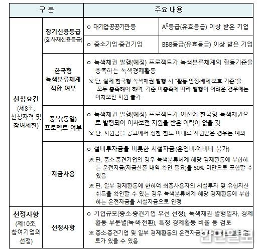 이번 지원사업은 지난해(2025년) 12월 말에 개정된 한국형 녹색분류체계를 반영하여 차세대 저탄소 기술을 폭넓게 지원하고, 자금 지원범위도 넓혀 기업의 수요에 부응하는 탈탄소 투자를 촉진한다.