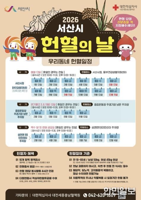 한민일보 서울포커스 임경복 기자 | 충남 서산시가 헌혈 기부 문화 정착과 안정적인 혈액 수급을 위해 ‘2026년 헌혈의 날’을 운영한다고 밝혔다.