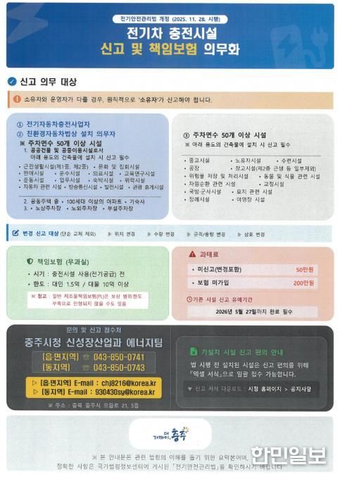 한민일보 서울포커스 김다남 기자 | 충주시는 '전기안전관리법'개정에 따라 전기자동차 충전시설 설치 및 변경 시 지자체에 사전 신고하도록 하는 ‘전기차 충전시설 신고제도’ 를 시행한다고 12일 밝혔다.
