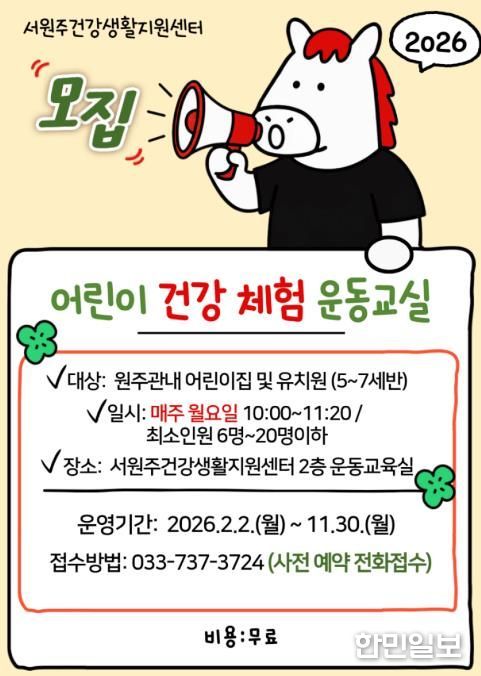 한민일보 서울포커스 임경복 기자 | 서원주건강생활지원센터는 지역 어린이들의 비만을 예방하고 올바른 운동 습관을 형성하기 위해 오는 2월부터 ‘어린이 건강 체험 운동교실’ 프로그램을 운영한다.