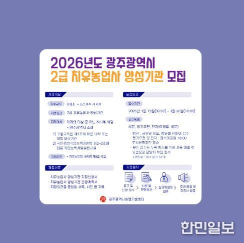 한민일보 서울포커스 임경복 기자 | 광주광역시 농업기술센터는 12일부터 30일까지 ‘2급 치유농업사 양성기관’ 지정을 위한 신청을 받는다.