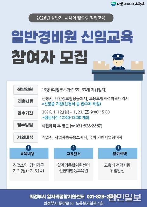 한민일보 서울포커스 심기옥 기자 | 의정부시는 관내 시니어 세대의 재취업을 지원하고 안정적인 일자리를 연계하기 위해 ‘일반경비원 신임교육’ 참여자를 모집한다.