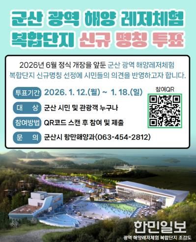 한민일보 서울포커스 김용택 기자 | 군산시가 군산 광역 해양레저체험 복합단지의 새로운 명칭과 관련한 시민 참여 선호도 조사를 18일까지 실시한다.