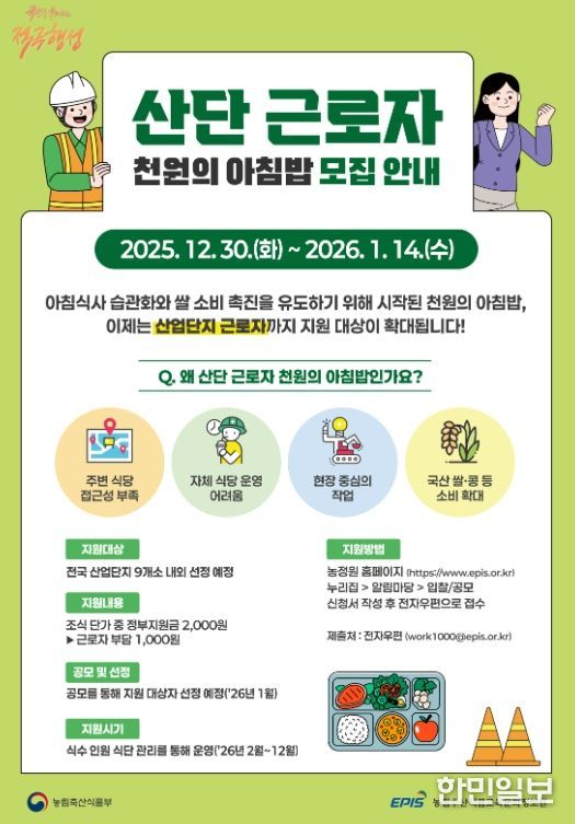 한민일보 서울포커스 임경복 기자 | 전라남도는 올해 중소기업 근로자에게 ‘천원의 아침밥’ 또는 ‘든든한 점심밥’ 사업을 지원한다.