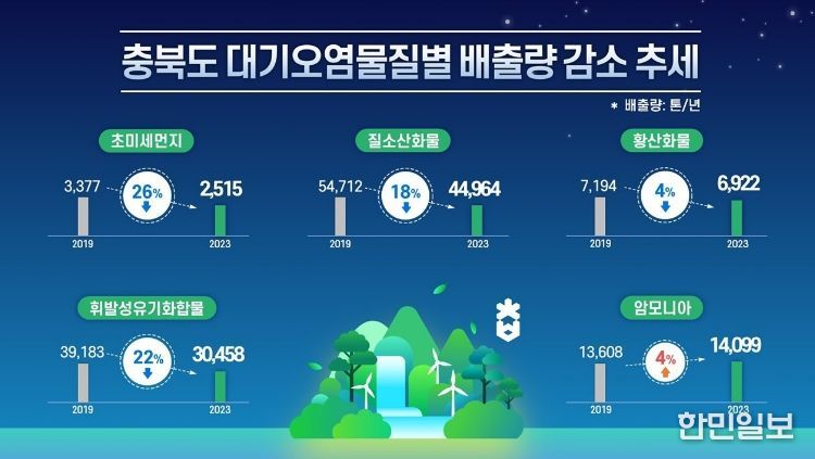 한민일보 서울포커스 임경복 기자 | 충북도는 ’23년 대기오염물질 배출량이 `19년 대비 큰 폭으로 감소했다고 밝혔다.