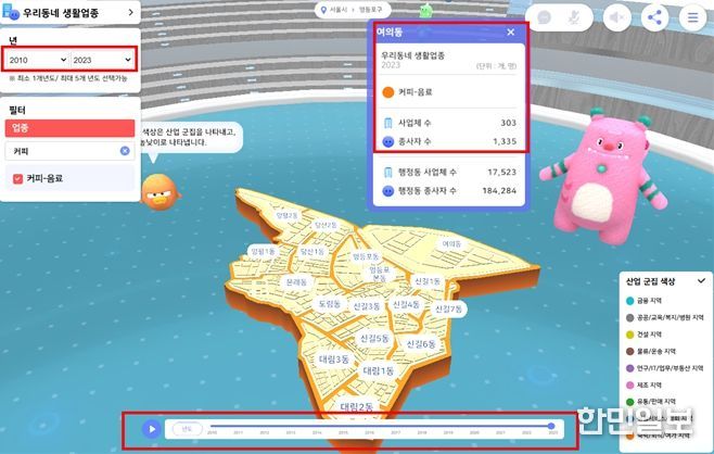 이번 서비스의 핵심 기능 중 하나는 2010~2023년 사업체 조사 데이터를 활용해 서울 전역 산업구조 변화와 흐름을 입체적으로 볼 수 있도록 ‘행정동 단위 산업․상권 변화’를 3차원 시각화한 기능이다. 특정 자치구나 행정동을 선택해 2010년 이후 어떤 산업이 성장하거나 쇠퇴했는지를 시간 흐름에 따라 확인할 수 있다.