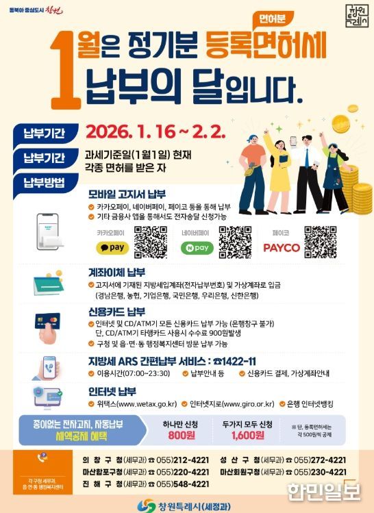 한민일보 서울포커스 김서윤 기자 | 창원특례시는 2026년 1월 정기분 등록면허세 130,641건, 38억 원을 부과하고 납세의무자가 납부기한을 넘기지 않도록 적극적인 홍보에 나섰다.