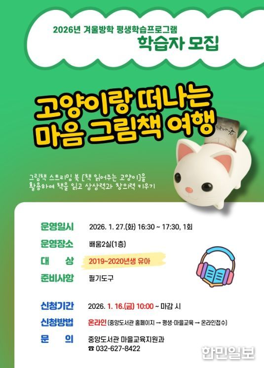 수강료는 무료이며 1월 27일에 운영되며, 참여 신청은 1월 16일 10시부터 중앙도서관 누리집에서 선착순으로 진행된다.