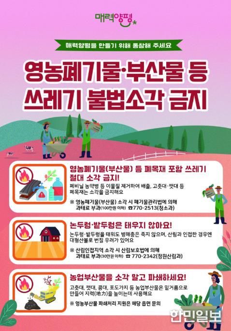 한민일보 서울포커스 차재만 기자 | 양평군은 봄철을 맞아 대기오염 방지와 산불 예방을 위해 영농부산물 및 폐기물 불법소각에 대한 집중 단속 계획을 수립하고, 본격적인 단속에 나선다고 13일 밝혔다.