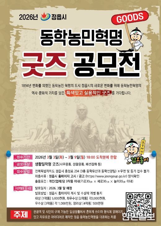 시는 시민과 관광객이 일상에서 역사를 친근하게 기억할 수 있도록 ‘2026년 동학농민혁명 굿즈(기념품) 공모전’을 개최한다고 14일 밝혔다.