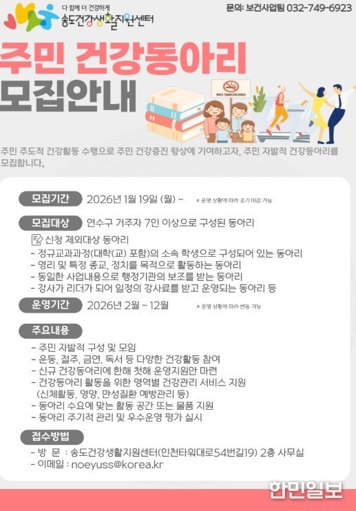 한민일보 서울포커스 백진욱 기자 | 연수구 송도건강생활지원센터는 주민들의 자발적인 건강 증진 활동을 지원하기 위해 오는 19일부터 ‘주민 참여형 건강동아리’를 모집한다.