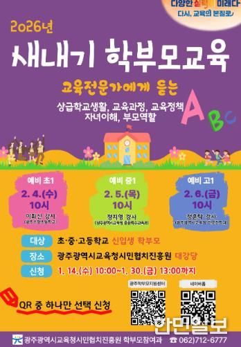 한민일보 서울포커스 임경복 기자 | 광주시교육청시민협치진흥원은 오는 2월 4~6일 본원 대강당에서 초·중·고등학교 신입생 학부모를 대상으로 ‘2026년 새내기 학부모교육’을 운영한다.