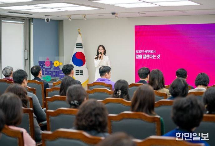 한민일보 서울포커스 임광현 기자 | 서울 동대문구는 14일 구청 5층 기획상황실에서 구청장과 6급 팀장 이상 관리자를 대상으로 ‘스피치 역량 강화 특강’을 열었다. 정책 설명과 내부 소통, 대민 응대 등 행정 현장에서 관리자의 말 한마디가 곧 조직의 신뢰로 이어지는 만큼, 공적 커뮤니케이션의 기본기를 점검하고 현장 적용력을 끌어올리기 위한 자리였다.