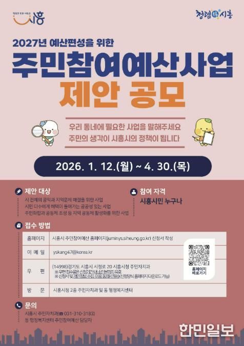 한민일보 서울포커스 유현민 기자 | 시흥시는 오는 4월 30일까지 주민들이 직접 사업을 제안하는 ‘시흥시 주민참여예산 제안’을 신청받는다.