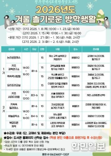 한민일보 서울포커스 임경복 기자 | 광주시교육청중앙도서관은 겨울방학을 맞아 오는 27일부터 2월 6일까지 초등학생을 대상으로 ‘겨울 슬기로운 방학생활’을 운영한다.