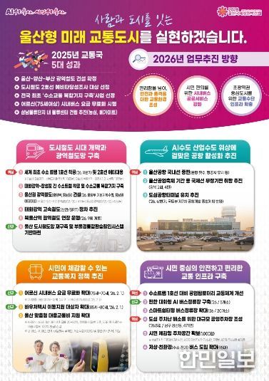 한민일보 서울포커스 임경복 기자 | 울산시는 사람과 도시를 잇는 울산형 미래교통 도시 실현을 위해 2026년 교통 분야 정책 방향을 수립하고 추진에 나선다고 밝혔다.