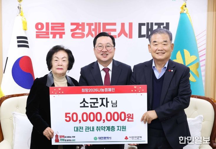한민일보 서울포커스 김서윤 기자 | 대전시는 15일 오전 시청 10층 응접실에서 아너소사이어티 회원인 소군자 기부자(124호)로부터 대전사회복지공동모금회를 통해 관내 취약계층 지원을 위한 성금 5천만 원을 전달받았다.