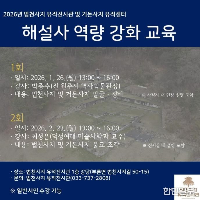 1회차 교육은 1월 26일 오후 1시부터 4시까지 전시관 1층 강당에서 열린다. 박종수 전 역사박물관장이 실무를 기반으로 ‘법천사지 및 거돈사지의 발굴·정비’에 대해 소개한다.