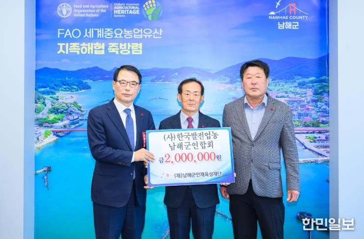 한민일보 서울포커스 김서윤 기자 | (재)남해군인재육성재단은 이철세 서면노인회 분회장, 중현떡집, 금송운수, (사)한국쌀전업농남해군연합회에서 인재육성기금을 기탁했다고 밝혔다.