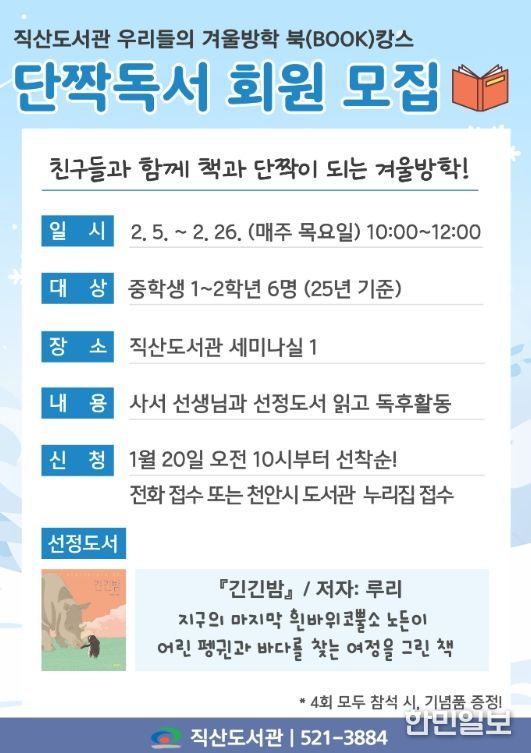 한민일보 서울포커스 황준형 기자 | 천안시 직산도서관은 겨울방학을 맞아 내달 5~ 26일 청소년 독서동아리 ‘단짝독서’를 운영한다고 16일 밝혔다.